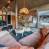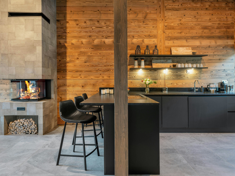 Large French windows bathe the room in natural light, and a central fireplace ensures a warm atmosphere all winter long. The modern kitchen is at the rear, separated from the living room by a simple countertop.