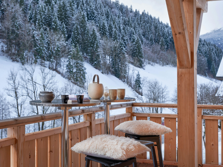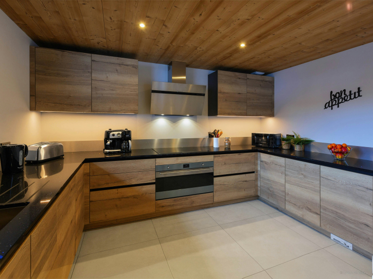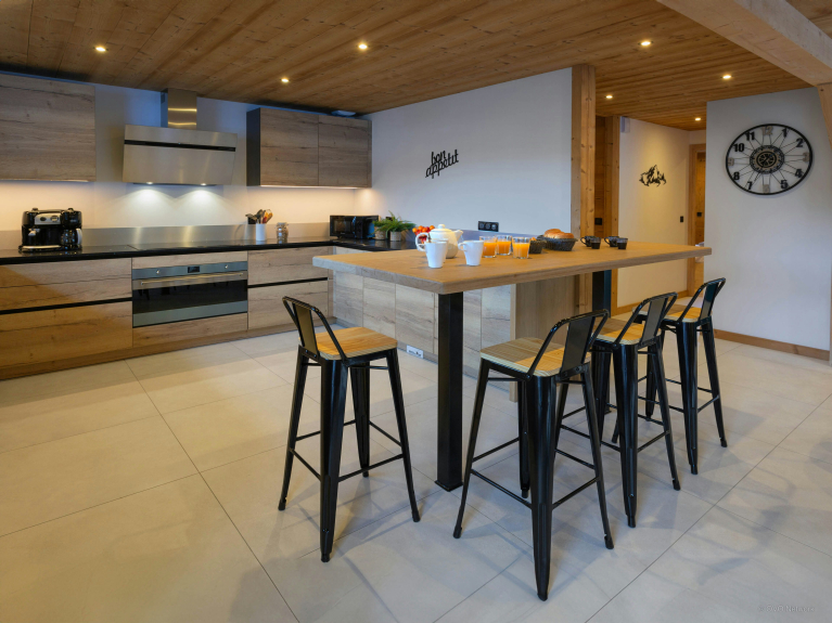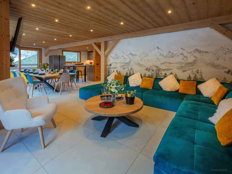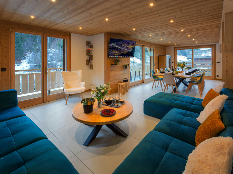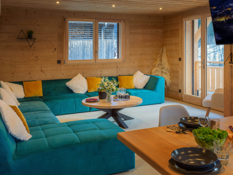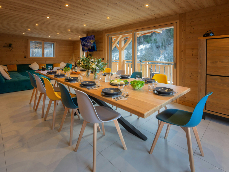 The large open-plan living area is the ideal place to unwind at the end of the day. Several French windows bathe it in natural light and open onto a panoramic terrace where you can enjoy the Alpine air. A huge sofa faces a TV, and you can enjoy the view from the dining table.