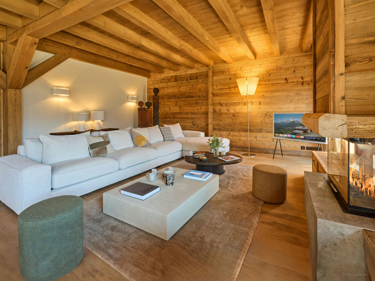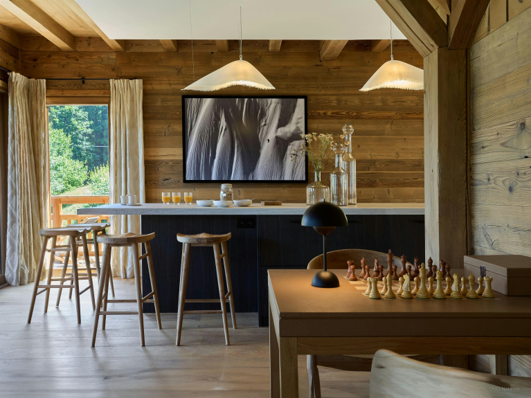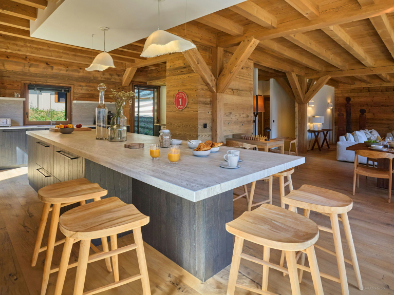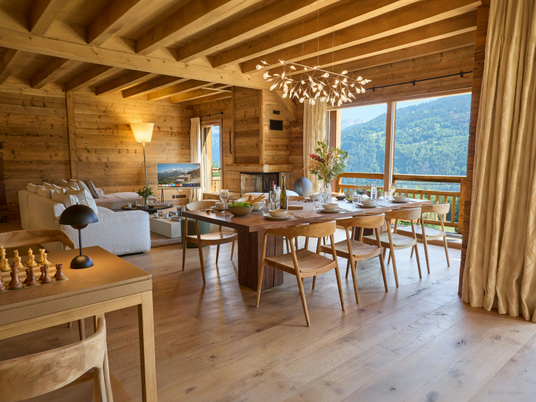 The bright, spacious living room is on the first floor. It features a large modular sofa facing a fireplace, a chess table, and a dining table that can accommodate your whole group. You'll enjoy preparing your meals in the open-plan kitchen, which features an oven, induction hob, dishwasher, fridge-freezer, microwave and central counter with stools. French windows lead to a covered terrace, where you can enjoy the barbecue and the majestic Alpine panorama.