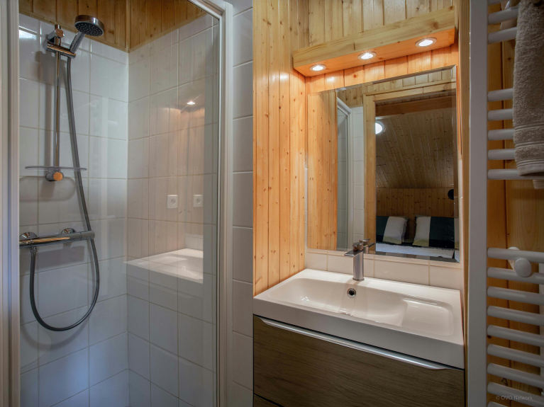 A first entrance leads to the living room, while a second entrance opens onto a ski room with heated boot dryer, which is particularly practical in winter.