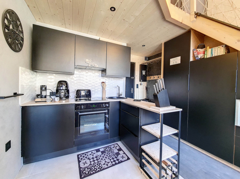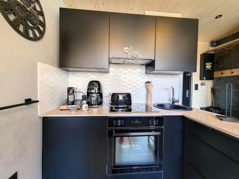 Open-plan kitchen with 3 induction hobs, fridge, conventional oven, microwave, dishwasher, toaster, coffee maker and kettle.