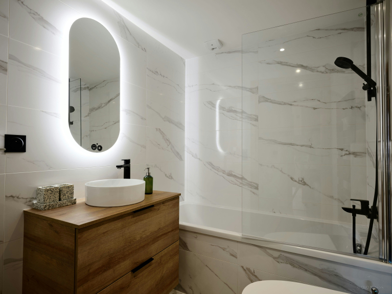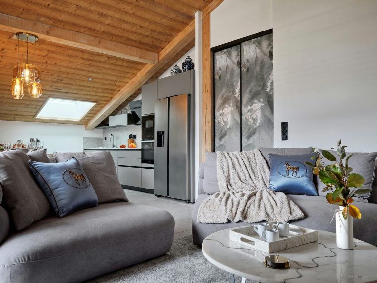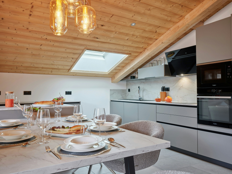 As soon as you enter, you're greeted by an open-plan living area, where the lounge, kitchen and dining room harmoniously complement each other. The living room features a TV, and the modern kitchen is fully equipped.