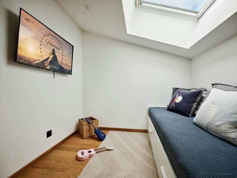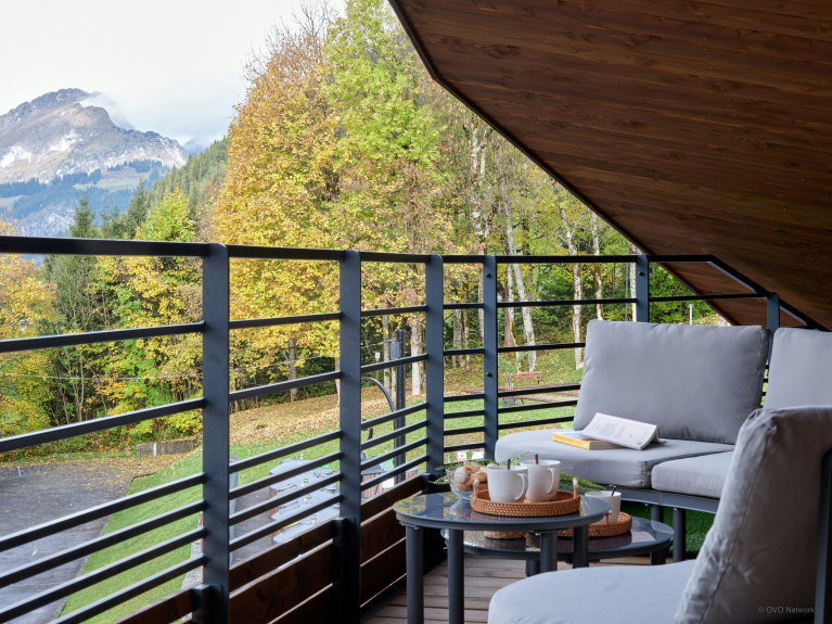 A balcony, complete with sofa, offers a privileged vantage point over the mountains and valley, and a playroom with sofa and TV provides children with plenty of entertainment.