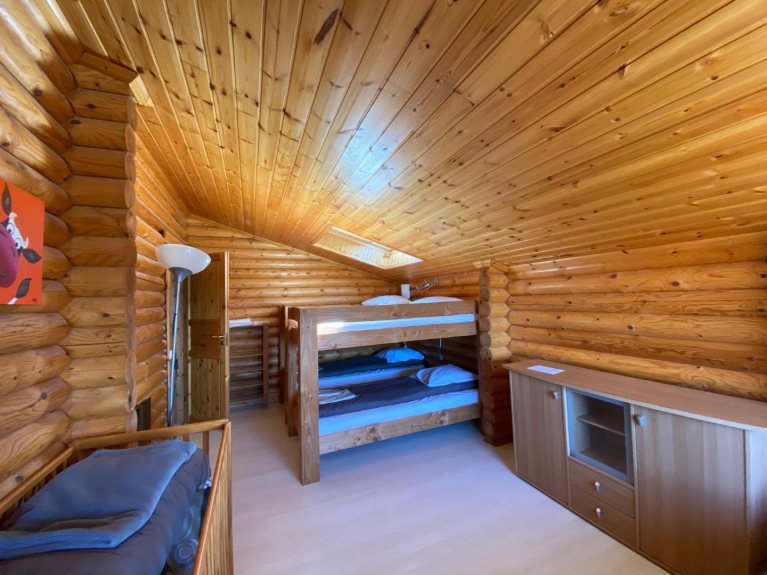 En la segunda planta: Un amplio entresuelo con una zona de lectura y una cama individual, un dormitorio (1 cama doble), un dormitorio de 20 m² con 4 literas (2x2), 1 cama doble y una cama de bebé, un hermoso cuarto de baño con ducha, WC y lavabo doble.