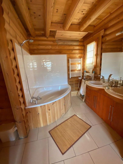 Una suite con cama doble (160cm) y baño (bañera de esquina de 140cm, WC, lavabo doble) y un WC separado.