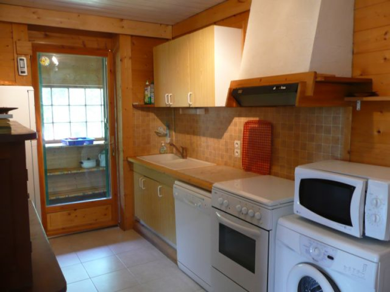 Cocina equipada: 1 encimera, muebles altos y bajos, 1 fregadero doble, 1 lavavajillas, 1 cocina de acero inoxidable, 4 quemadores de GAS + horno eléctrico, 1 nevera-congelador, 1 aparador, 1 armario, utensilios de cocina, batidora, mezclador, tostadora, cafetera, hervidor de agua, máquina de raclette y fondue, 1 microondas, etc.