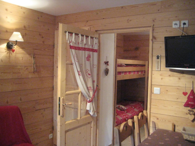 Encantador piso recientemente renovado, y decorado en estilo chalet con mucha madera. Equipamiento 3* para 4 a 6 personas (4 en invierno y 6 en verano). 1 dormitorio cerrado independiente con 1 cama doble, 1 rincón de montaña cerrado con 2 literas, y un salón-cocina, con sofá-cama;