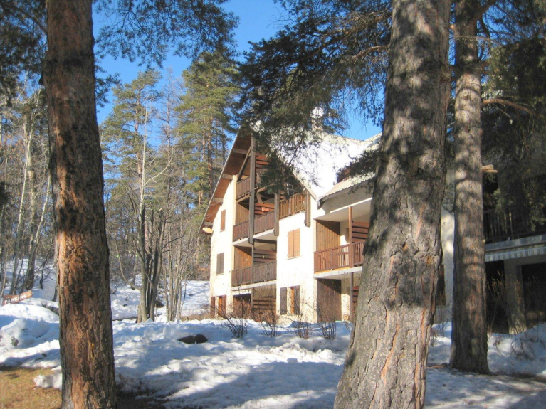 Situado en una pequeña residencia en medio de los pinos, en el lado sur de la estación, frente a las pistas.