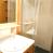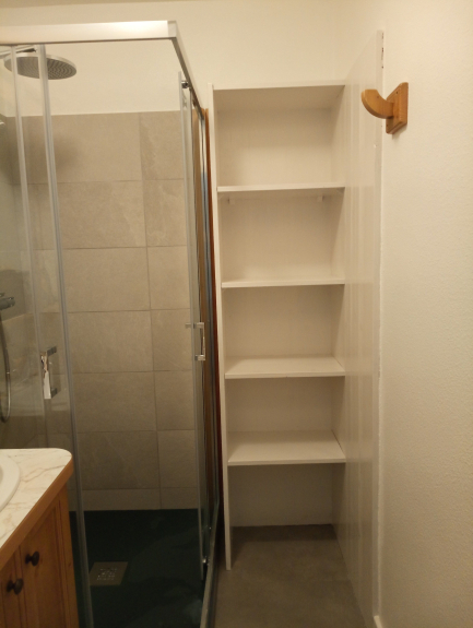 Frente a la entrada: cuarto de ducha, lavabo y estantes de almacenamiento; aseo separado