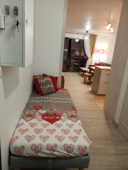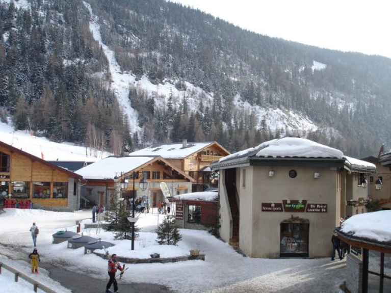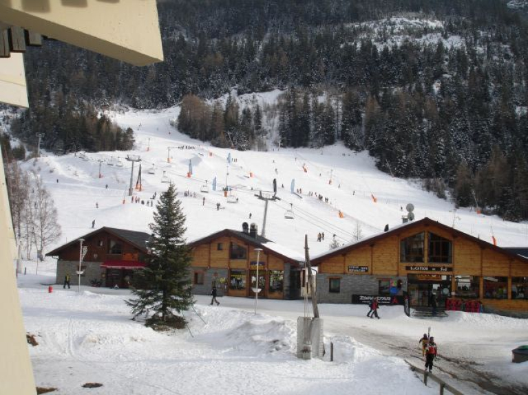 La ventana francesa de la habitación se abre a un balcón orientado al sur con vistas a la entrada del pueblo (tiendas), así como a la llegada de las pistas.