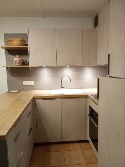 Suelo: de baldosas (cocina y baño), de linóleo para el salón