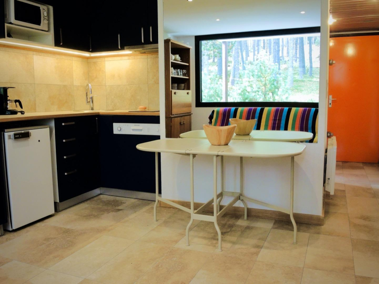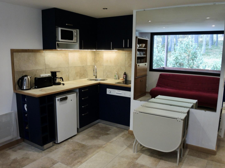 El salón se abre a una nueva cocina equipada con vitrocerámica, microondas, nevera y lavavajillas. En los numerosos armarios encontrará suficientes utensilios de cocina y vajilla para 5 personas.