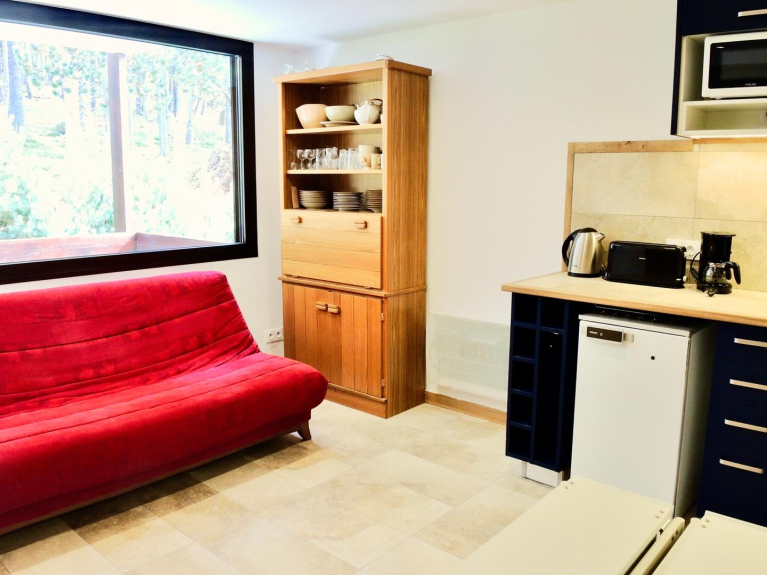 Un pequeño pasillo te lleva a un luminoso salón con una magnífica vista del bosque y las pistas. Está equipado con un sofá cama, amueblado con una sala de estar en olmo rubio que ofrece mucho espacio de almacenamiento.