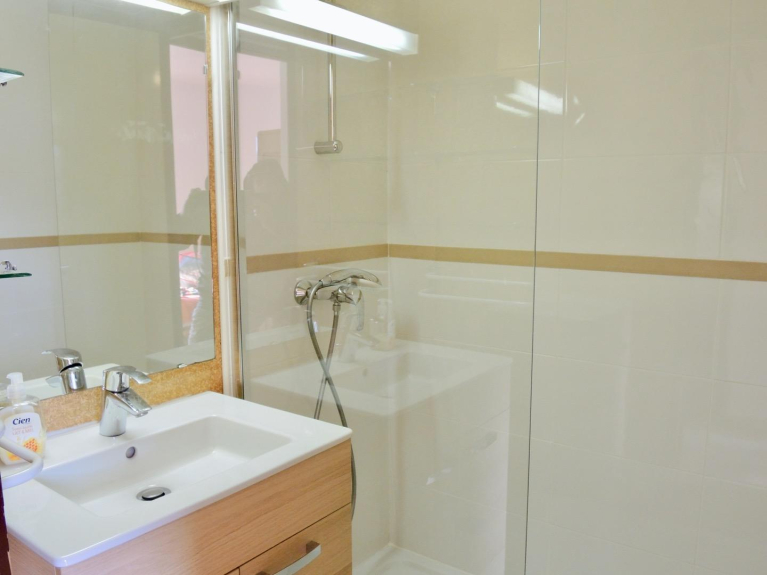 El cuarto de ducha, contiguo a la zona de dormitorio, tiene una ducha a ras de suelo, un lavabo con mueble de almacenamiento y un inodoro.