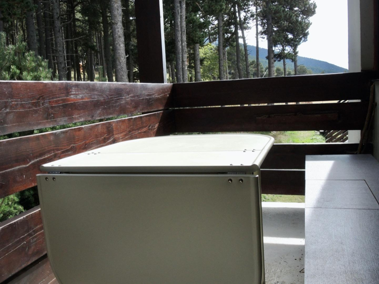 La ventana francesa del gran ventanal permite llegar a la hermosa terraza soleada que da al bosque, al pie de las pistas de esquí. Esta terraza está equipada con una mesa, un banco, 2 cajas de almacenamiento y un tendedero.