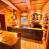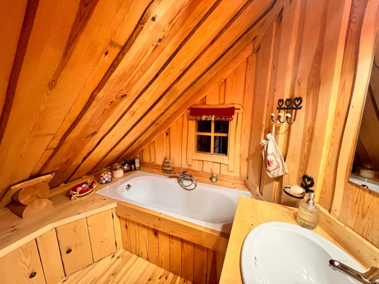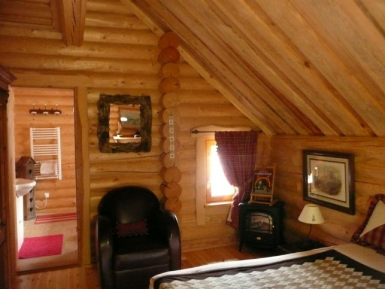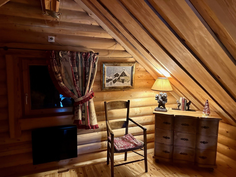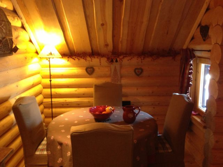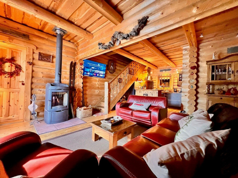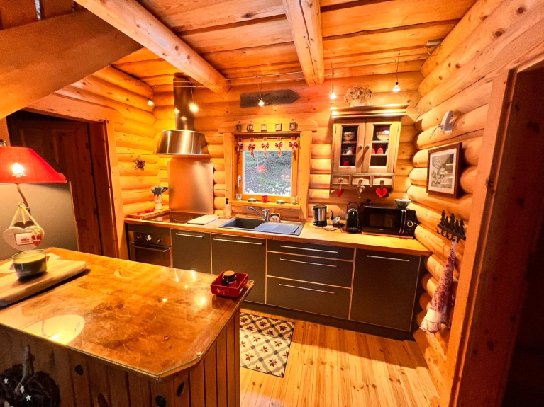Cabaña de madera finlandesa con todas las comodidades, muy acogedora, con mucho encanto y con una decoración montañesa muy cuidada, para un máximo de seis personas, con tres dormitorios, un cuarto de baño y un cuarto de ducha, dos aseos, una zona de comedor, una cocina americana totalmente equipada y una sala de estar con una estufa, un televisor de pared.