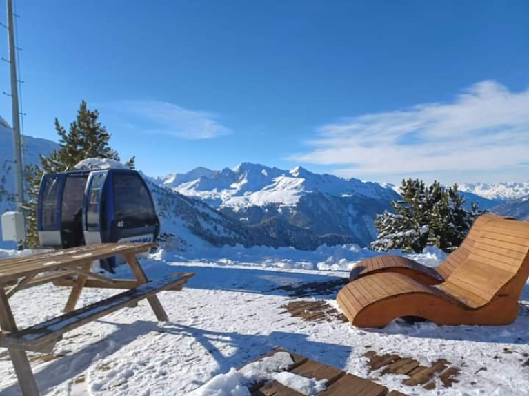 duerme, decorado en estilo montañés. Piso con balcón, muy luminoso por su orientación sur y su agradable vista sobre el corazón de la estación, sobre la montaña y las pistas. Consta de una sala de estar con cocina americana, dormitorio, baño con ventana, aseo independiente, balcón con tumbona.