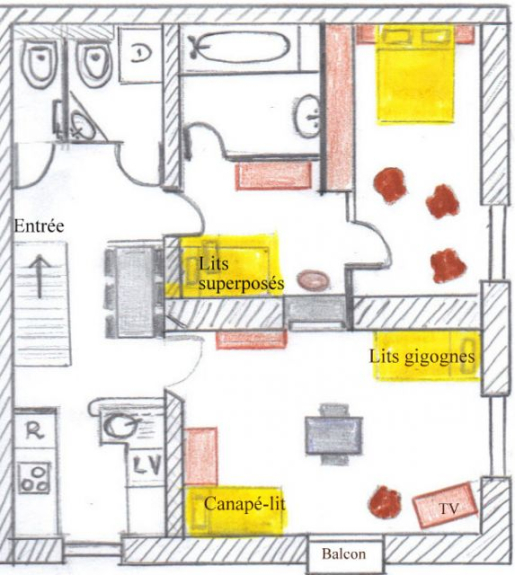 Un dormitorio principal, un dormitorio con literas, un salón que hace las veces de dormitorio con una cama nido y un sofá cama. Una cocina americana abierta al comedor con lavavajillas, placa y horno multifunción (microondas, calor por convección, grill) y todos los utensilios de cocina.