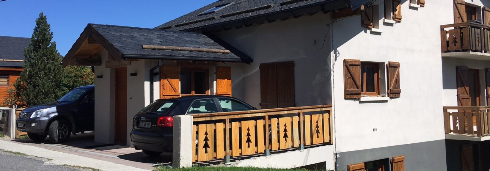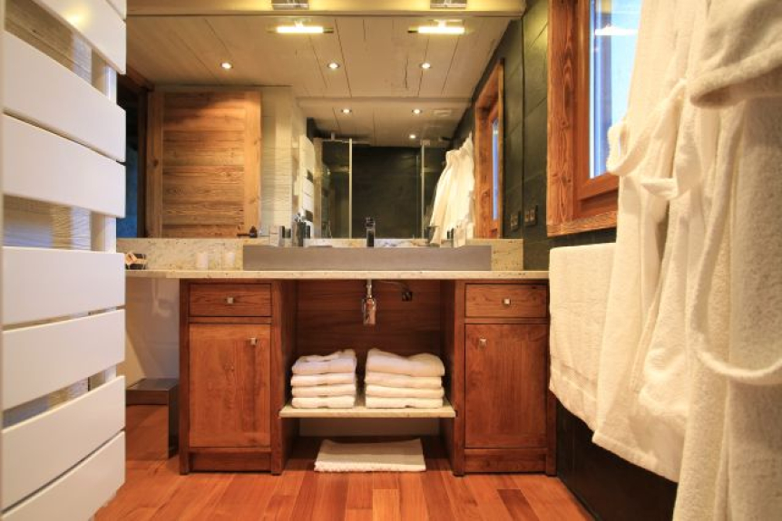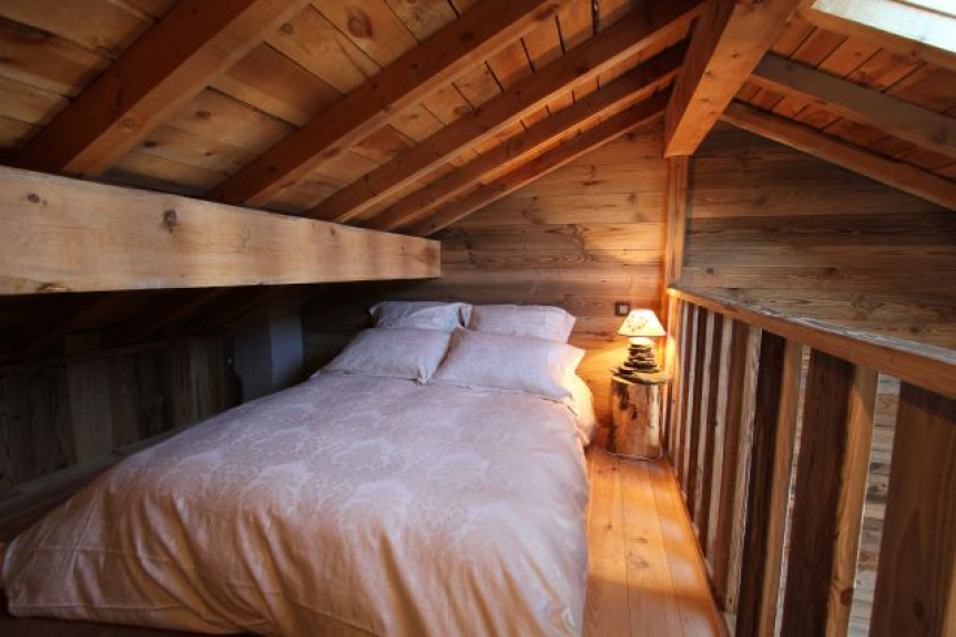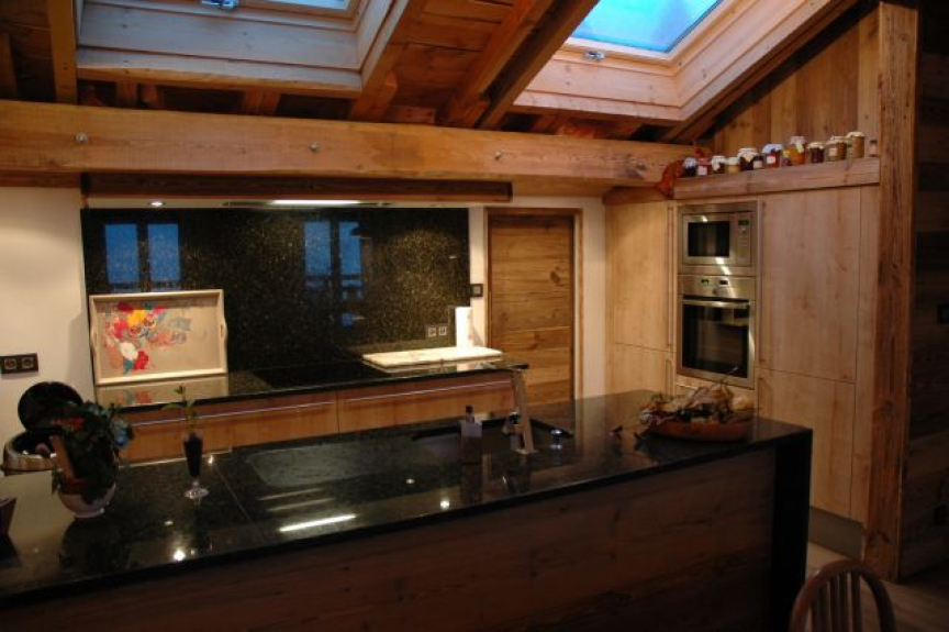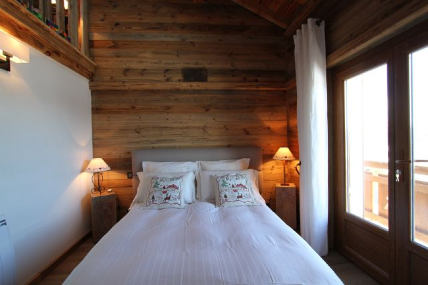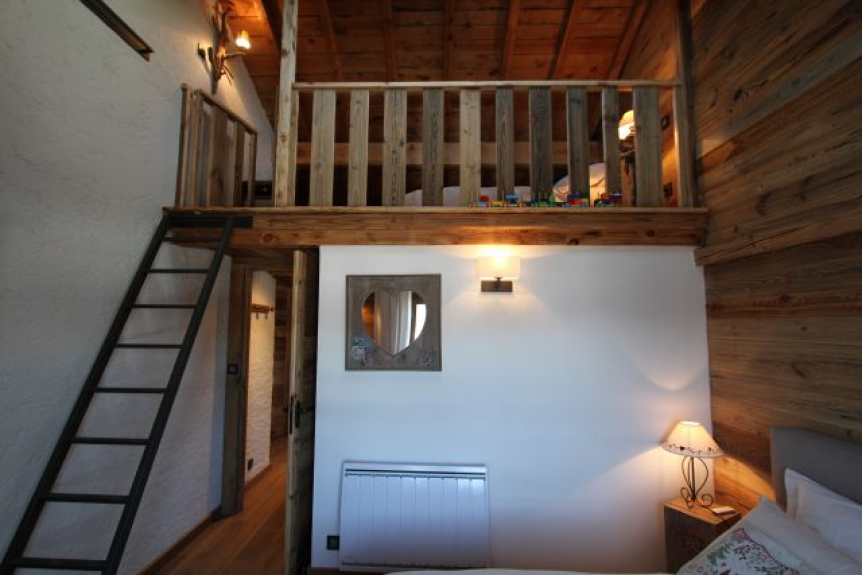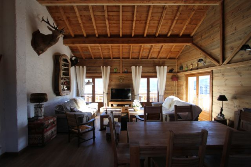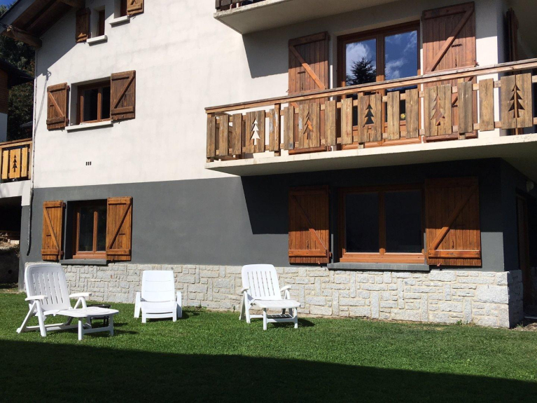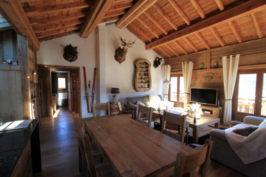 Una gran sala de estar, una cocina abierta totalmente equipada, dos dormitorios, uno de los cuales se abre a un entresuelo, un cuarto de ducha, un gran balcón, un jardín, una gran sala para esquís, trineos y botas.