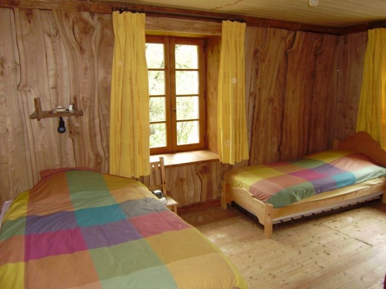 En la primera planta, el granero tiene capacidad para 8 personas y consta de un salón catedralicio con chimenea central/comedor/cocina, 3 dormitorios, un gran entresuelo/sala de juegos con sofá cama (que puede utilizarse como cuarto dormitorio), 2 baños y 2 aseos.