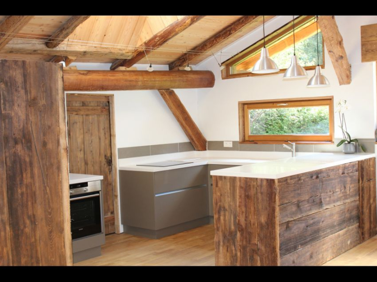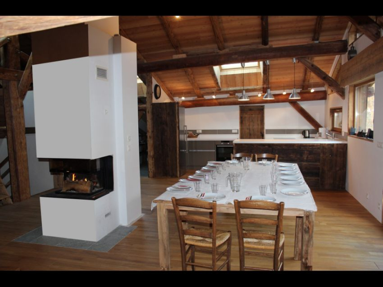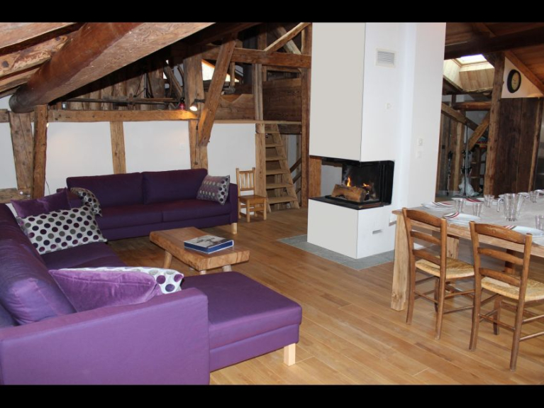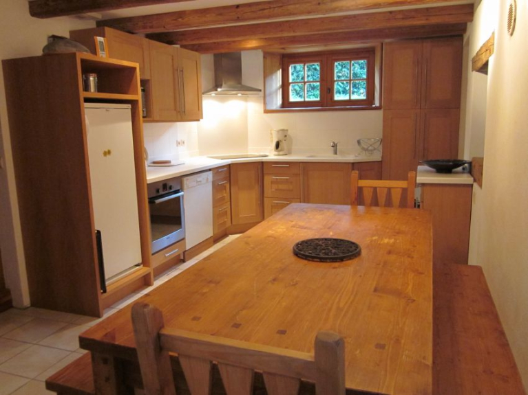 Cuidadosamente restaurada en madera antigua y vigas originales, tiene un gran salón catedralicio de unos 70m² con vigas vistas y chimenea. Ambiente muy acogedor con todas las comodidades modernas y calefacción por suelo radiante. Nuestra casa de campo es especialmente adecuada para las reuniones familiares o de amigos, ya que cuenta con amplios espacios para reunirse.