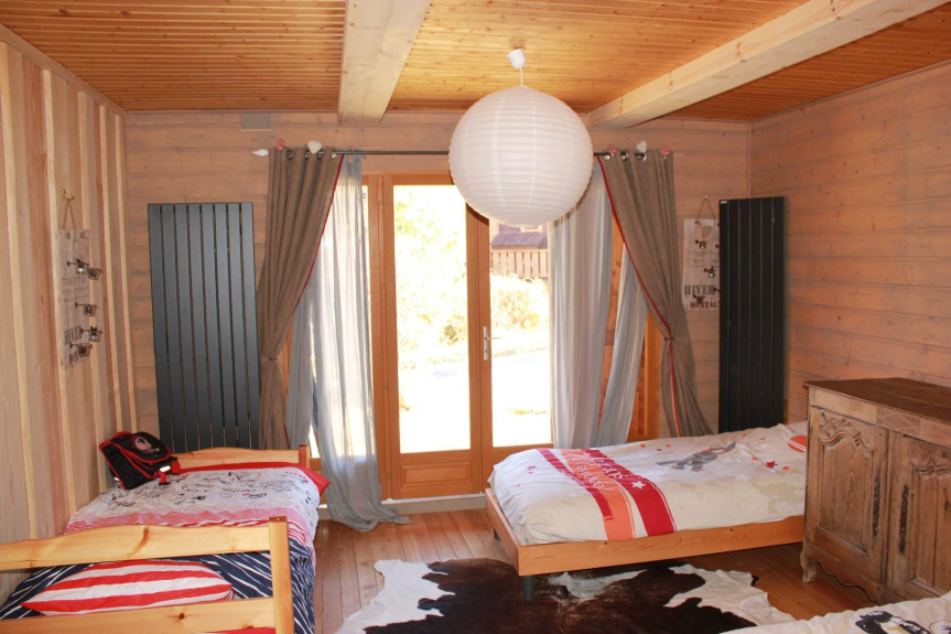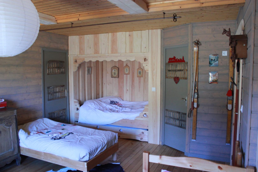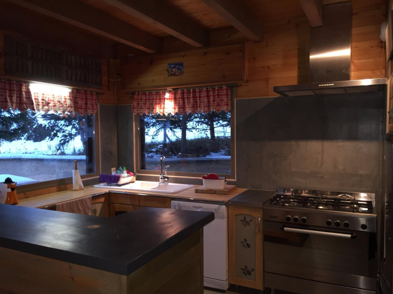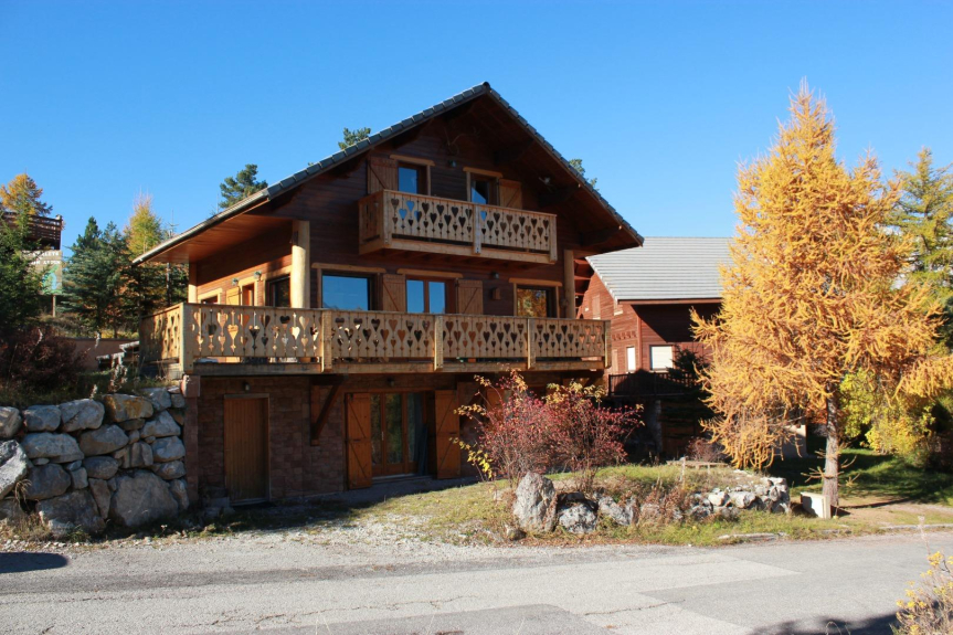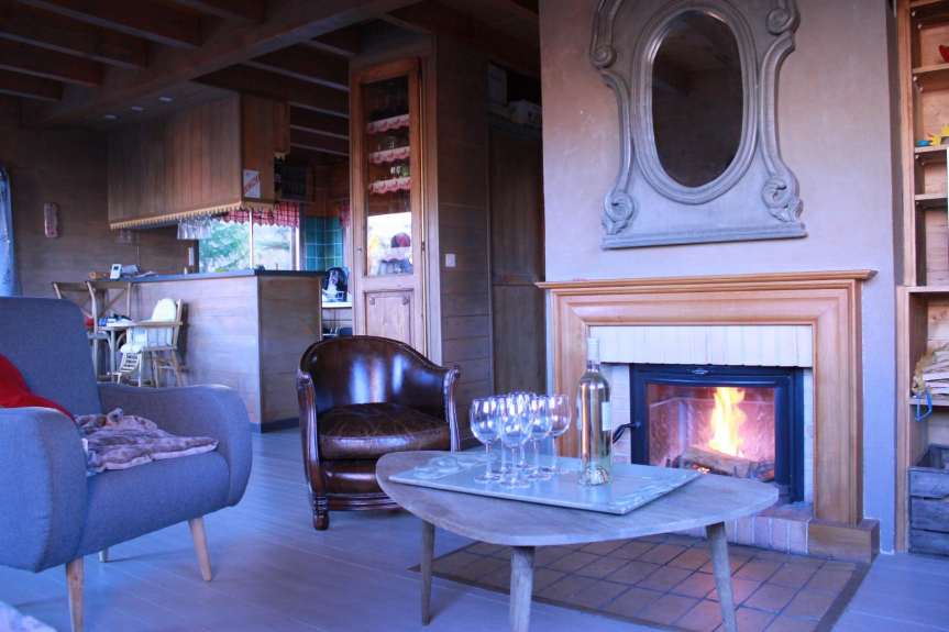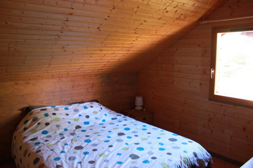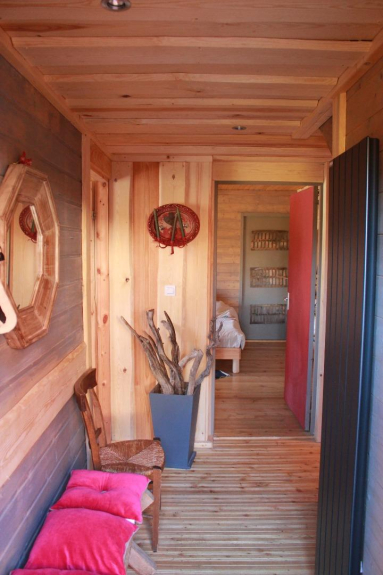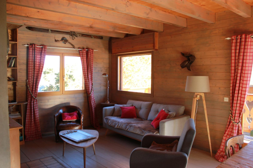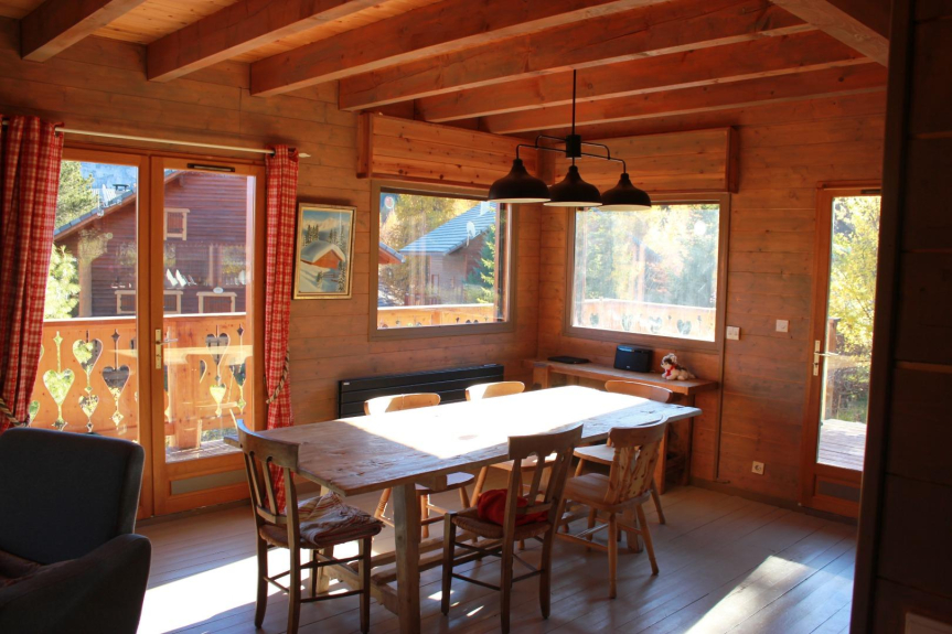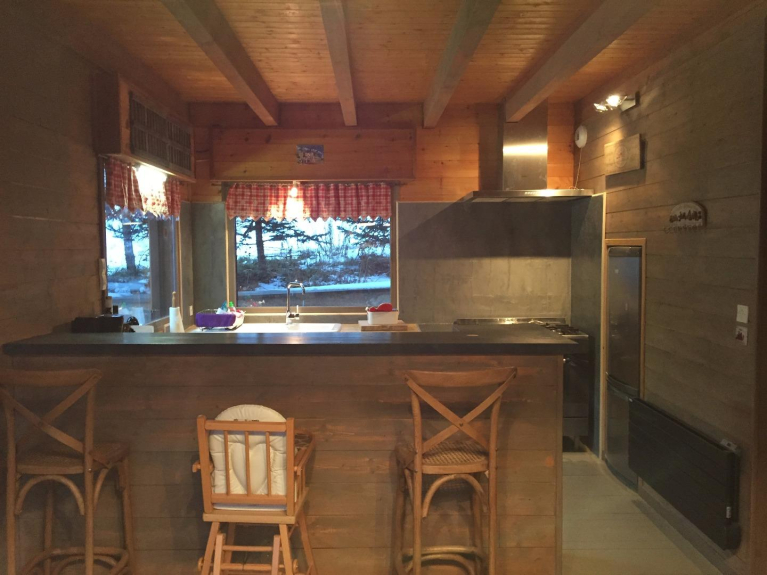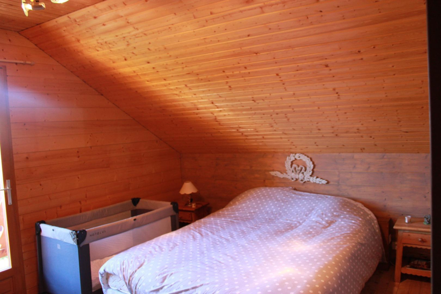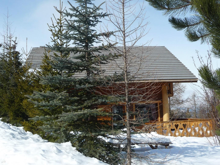 Magnífico chalet de madera en 3 niveles con gran terraza orientada al sur (gran mesa), aparcamiento privado para 2 coches.
