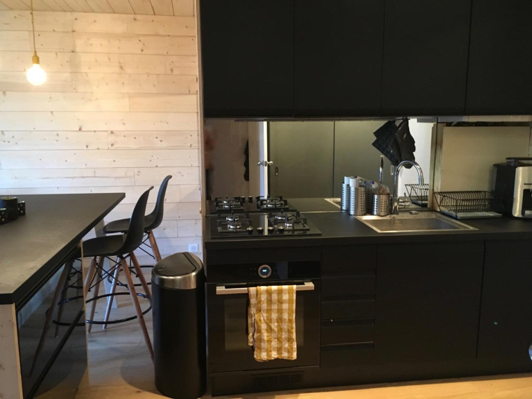 -una cocina con una placa de inducción de 4 fuegos, un horno multifunción, un lavavajillas, un hervidor de agua y una cafetera (café en grano)