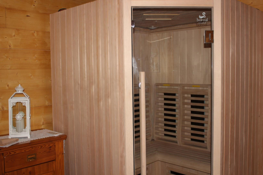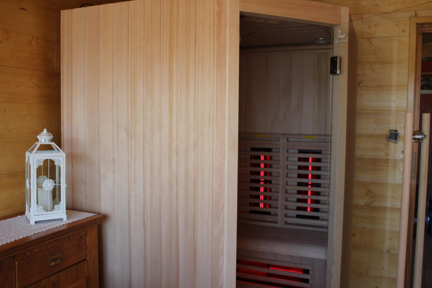 -Una sala orientada al sur con una sauna de infrarrojos (tecnología Boreal certificada de espectro completo) para cuatro personas y una mesa de billar.