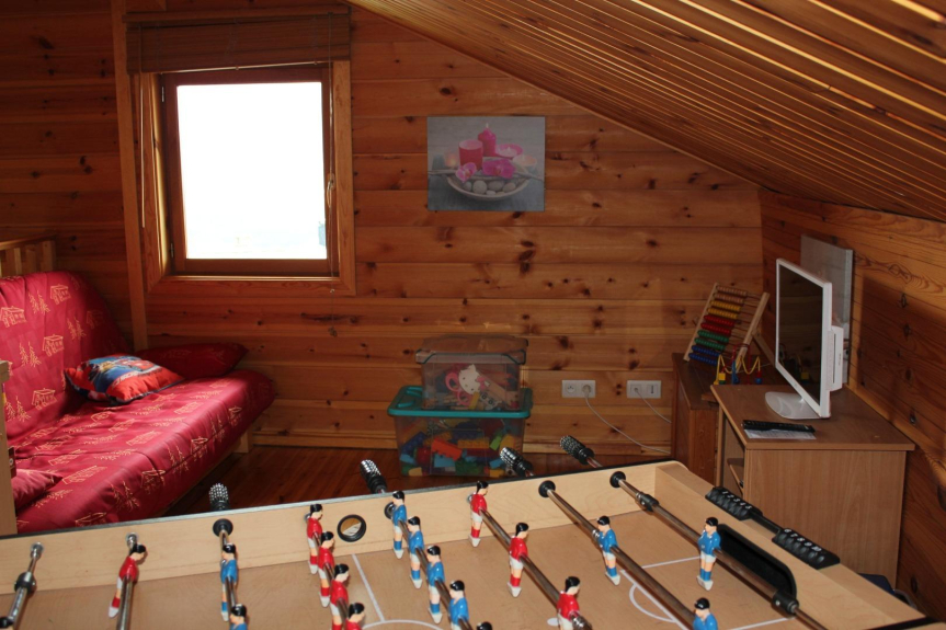 -Un altillo con sofá y televisión HD/reproductor de DVD. Juegos de mesa y mini futbolín