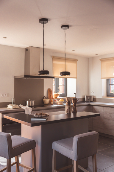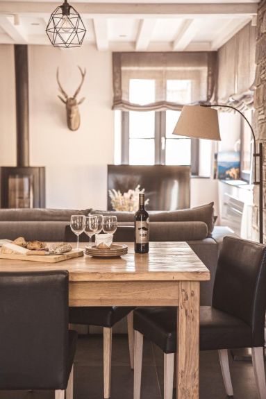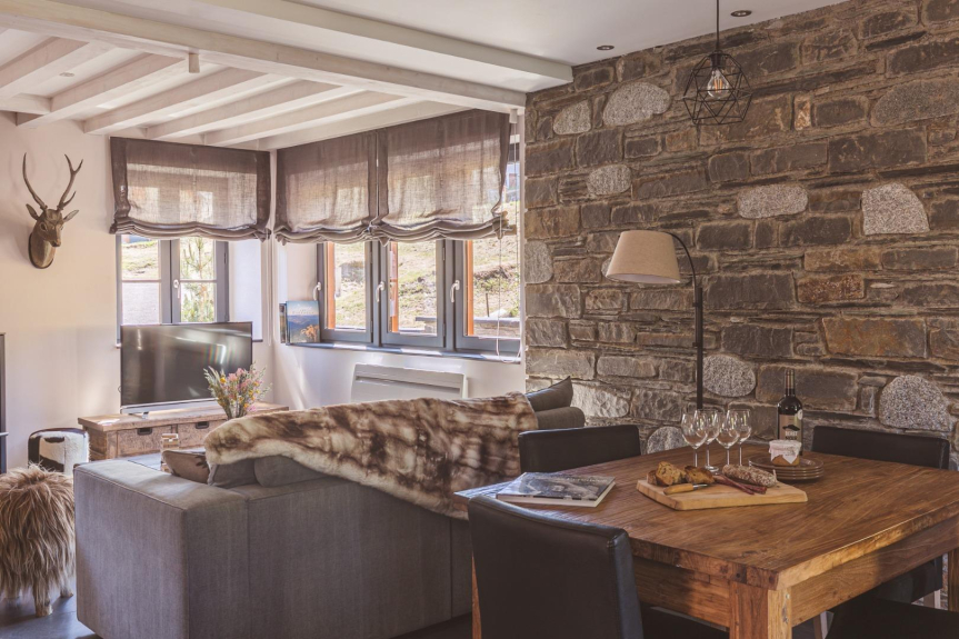 La zona de estar consta de una cocina abierta totalmente equipada, una zona de comedor para un máximo de 6 personas y una sala de televisión con una estufa de leña. Este nivel se completa con un pequeño lavadero y un aseo.