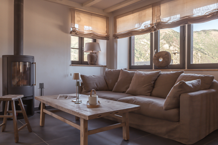 Desde la sala de estar se accede al jardín y a la terraza orientada al oeste con vistas despejadas a las montañas.