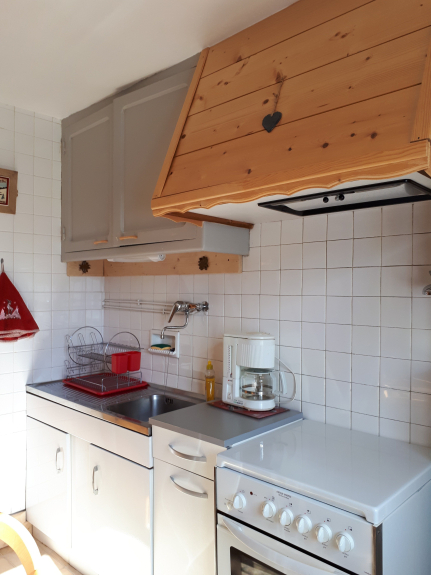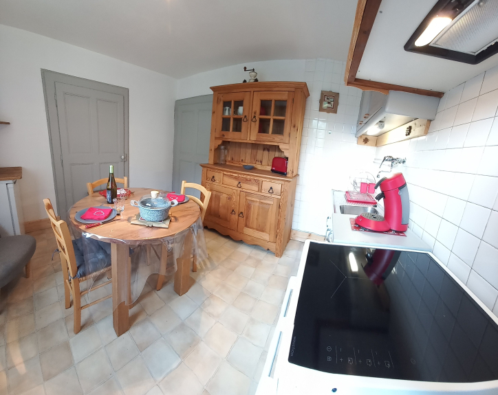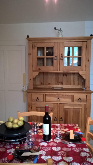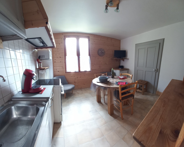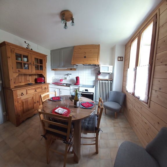 1 comedor + zona de cocina con 3 fuegos de gas + 1 placa eléctrica, horno, microondas, nevera, cafetera, hervidor de agua, tostadora, tabla de planchar y plancha, TV, reproductor de DVD, ventilador (verano), radio, sillones.