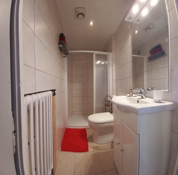1 baño: lavabo, alfombra de ducha, WC, ducha y secador de pelo.
