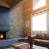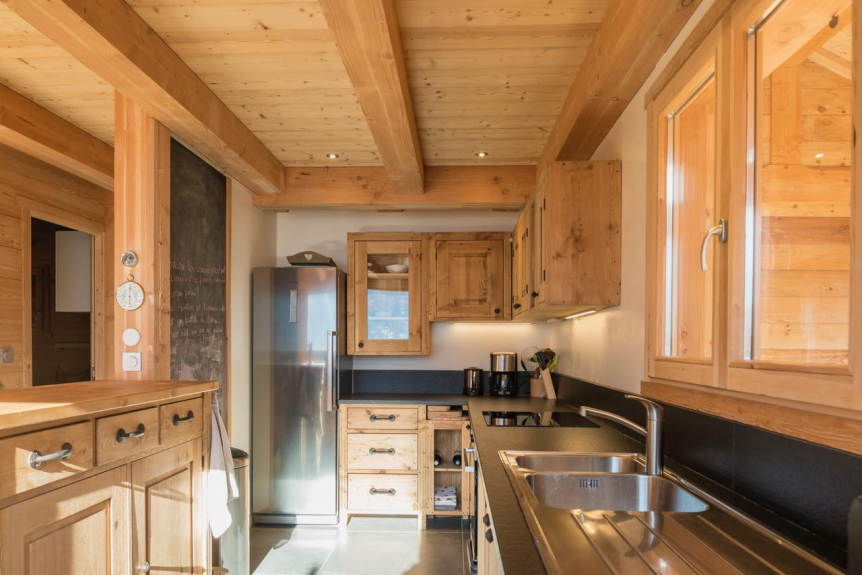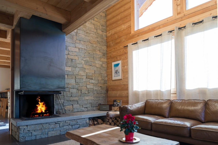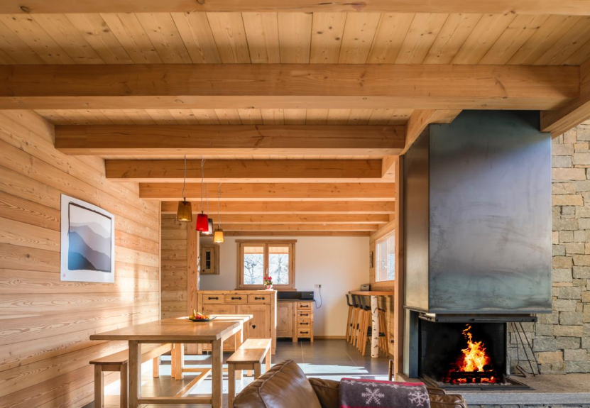 Cocina abierta, bar y gran mesa con vistas, acogedor salón con chimenea.