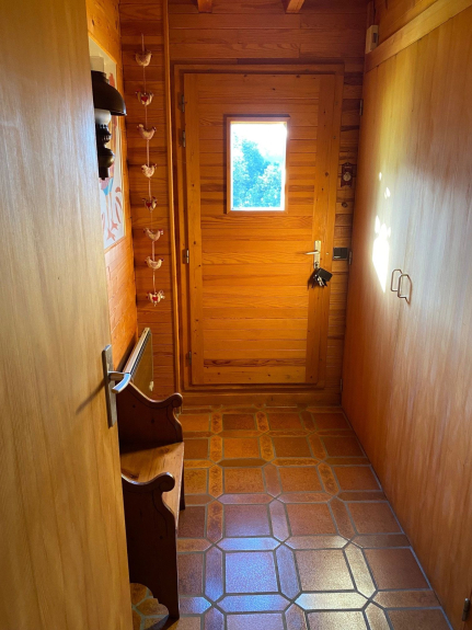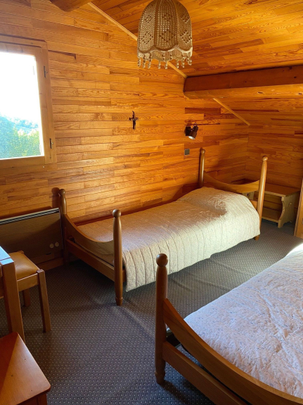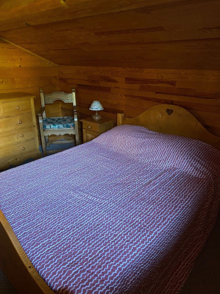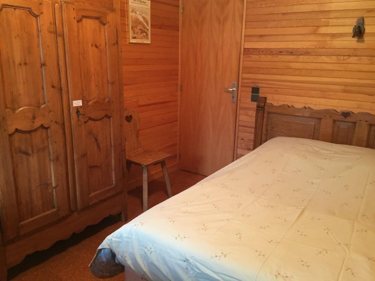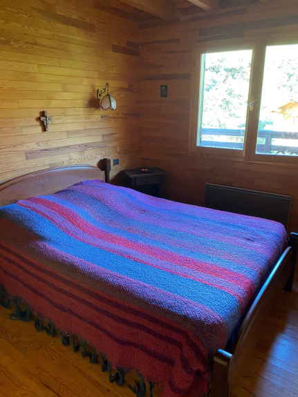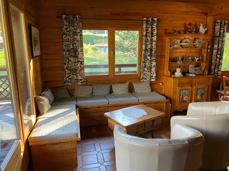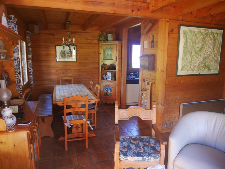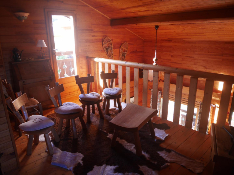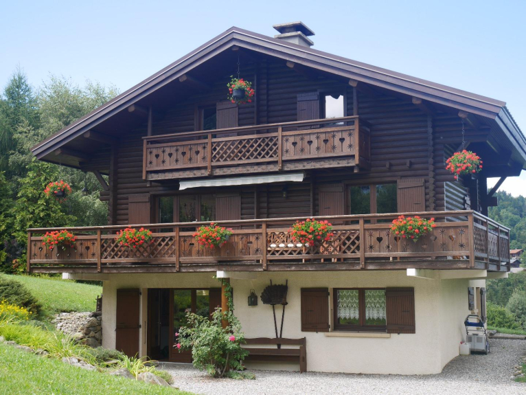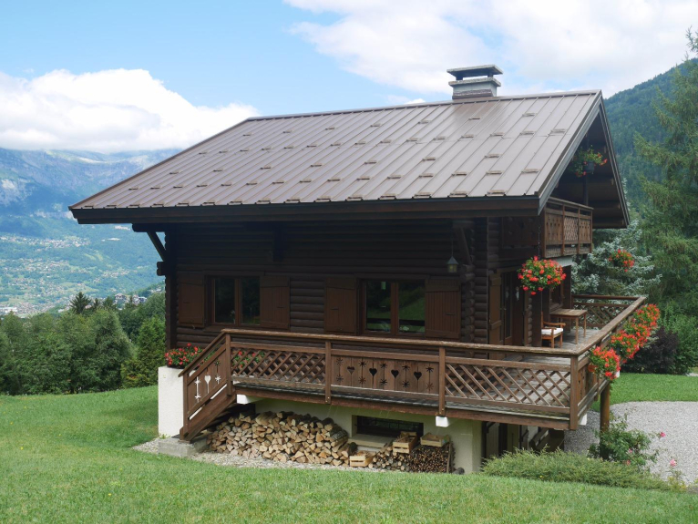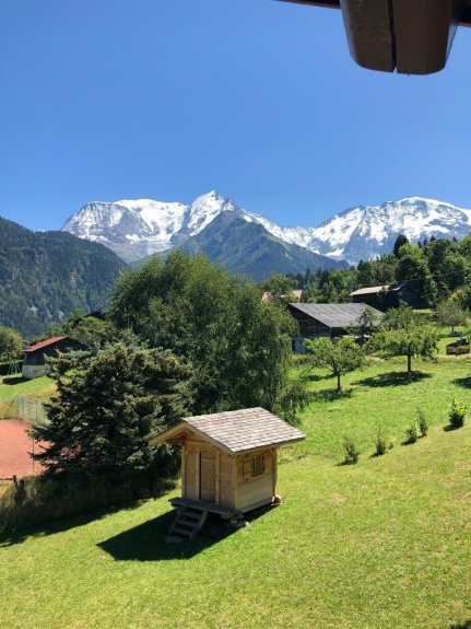 Chalet situado a 1000 m en 3 niveles con una magnífica vista del macizo del Mont Blanc. Panorama de 360°. Balcón orientado al sur.