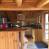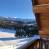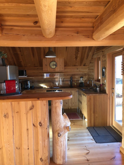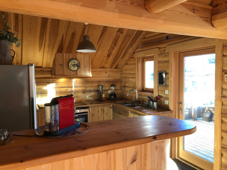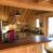 Cocina abierta con su barra de convivencia en la decoración típica y cálida de los chalets de montaña que da a una gran terraza con dos mesas para las comidas al aire libre.
