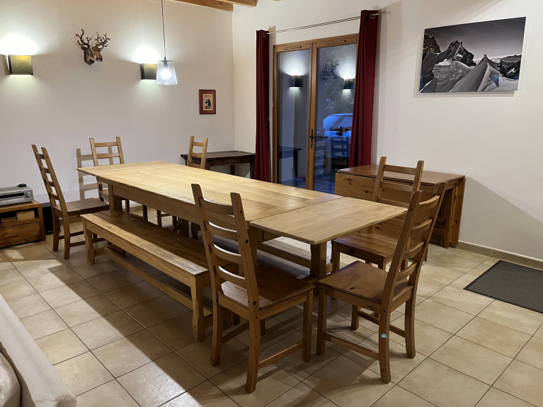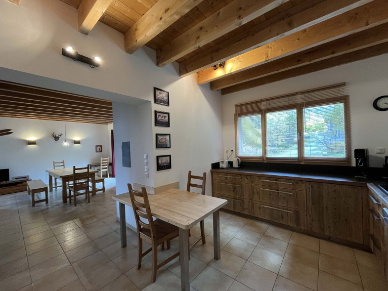 Chalet reciente para 15 personas con jardín. Salida del telesilla Girodière a unos 200 m por carretera o camino privado. 5 habitaciones con camas dobles y un dormitorio con 5 camas individuales. Amplio salón de 62 m2 . Equipamiento: cafetera nespresso y de filtro, hervidor de agua, sodastream, placa de inducción, horno de pirólisis, lavavajillas, lavadora y secadora, Wi-fi, TV, reproductor de DVD, futbolín, cuna. Alquiler de domingo a domingo solamente