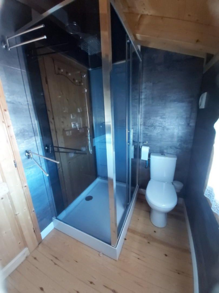 El cuarto de baño tiene una cabina de ducha, dos lavabos y un inodoro.
