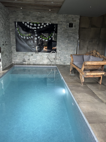 Una piscina cubierta de 4,5 m por 2 m equipada con un baño a contracorriente y una zona de balneoterapia con hidromasaje. El agua se calienta y se mantiene entre 28 y 30°.