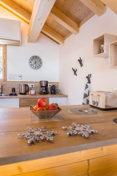 La hermosa sala de estar se encuentra en el segundo piso, directamente bajo la magnífica estructura del techo, con grandes ventanas que dan acceso a la terraza orientada al sur para aprovechar al máximo las magníficas vistas del pueblo y las montañas. Amplio salón con chimenea, cocina totalmente equipada.
