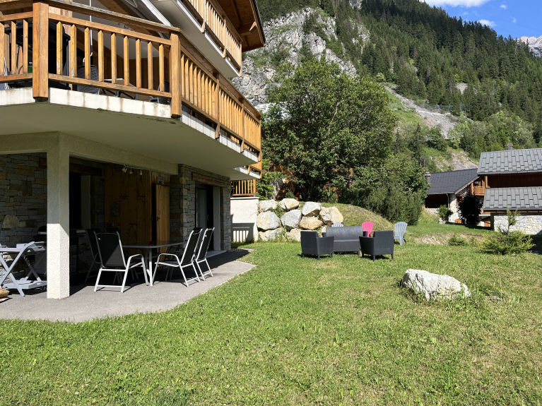 Instalaciones exteriores : terraza con acceso directo al terreno privado - muebles de jardín - barbacoa - aparcamiento privado - sala guardaesquís