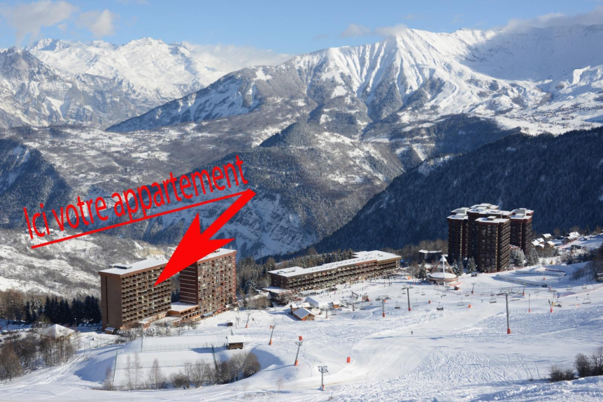 El piso se encuentra en la séptima planta de un condominio de diez pisos llamado COSMOS, situado en el centro de la estación a pie de pistas.