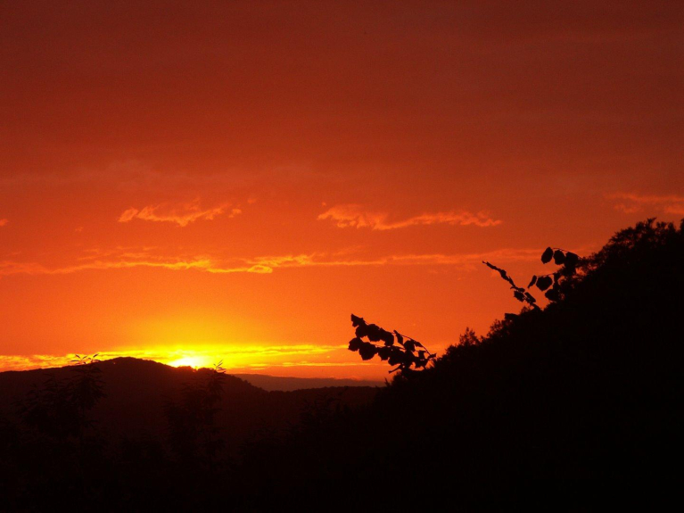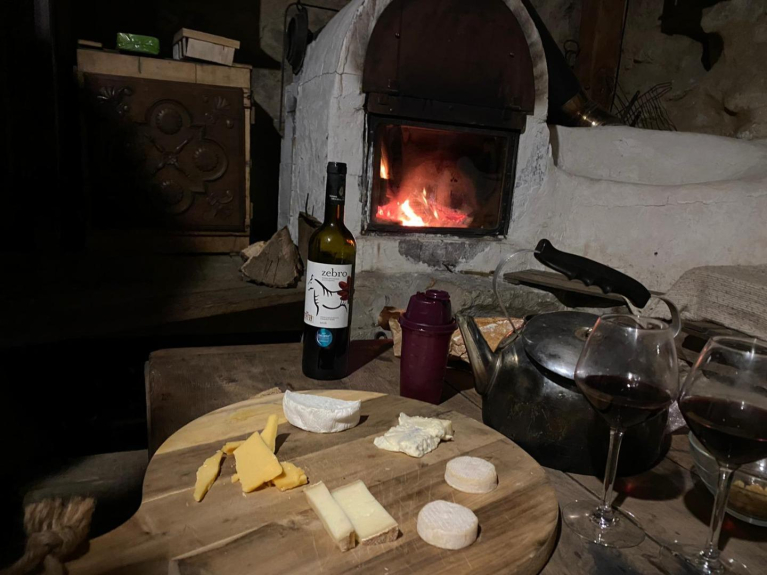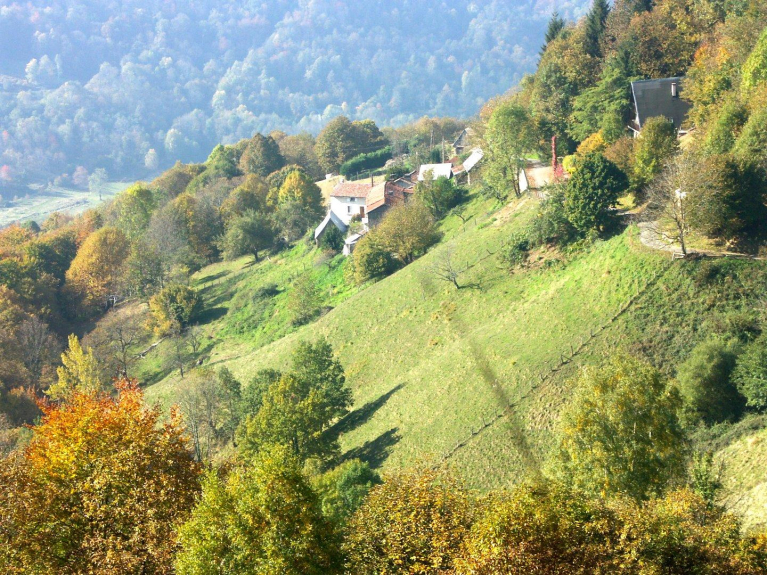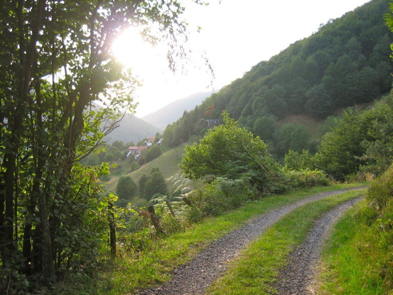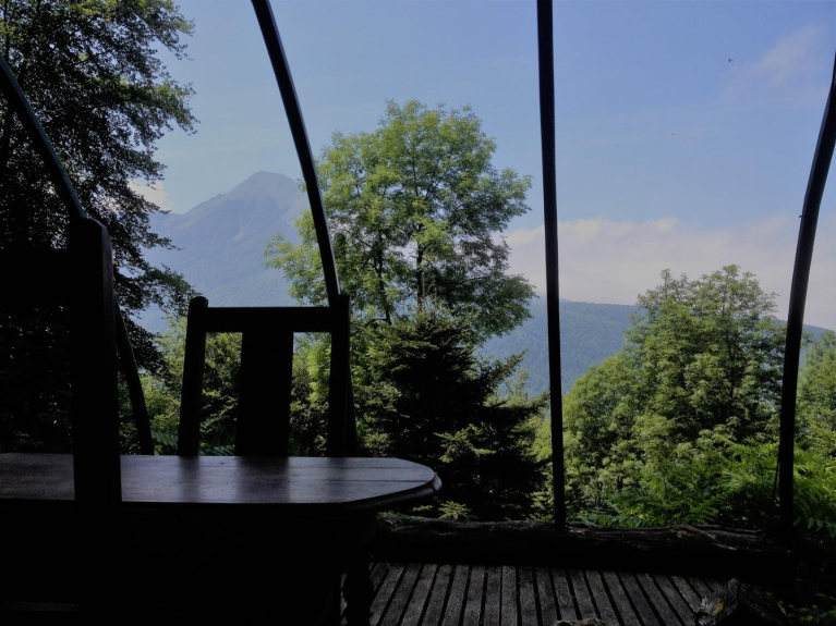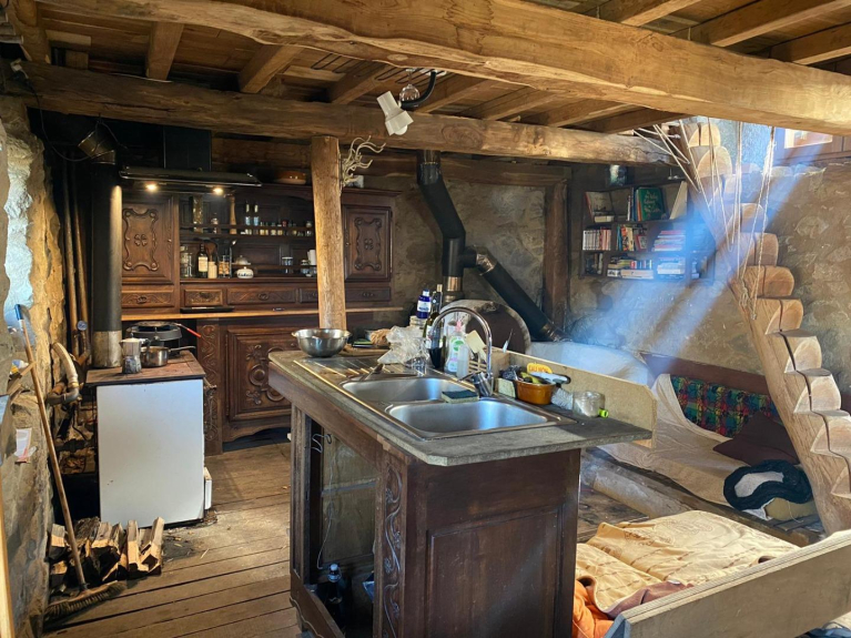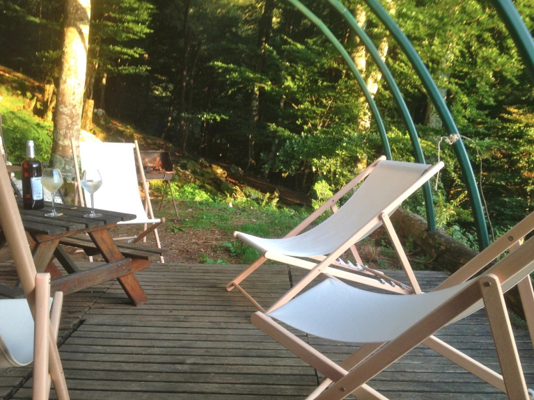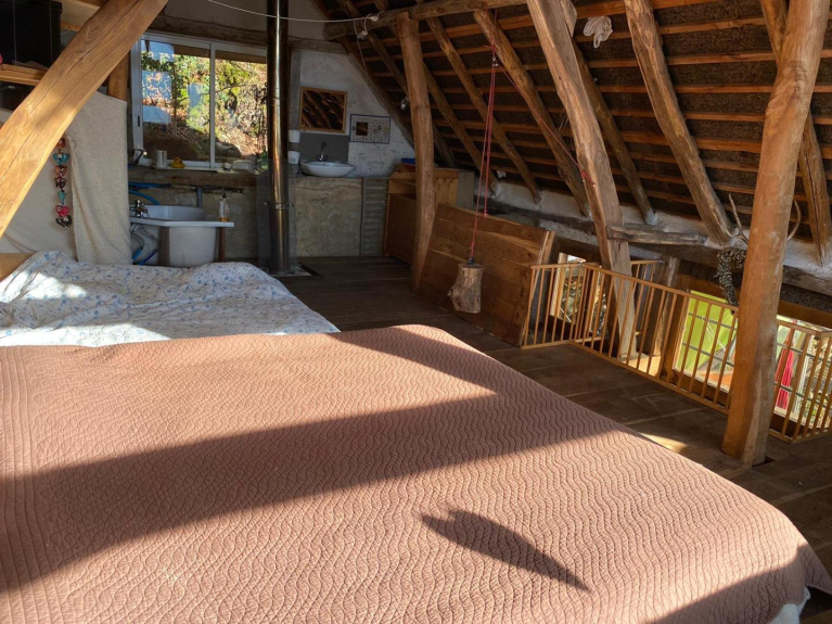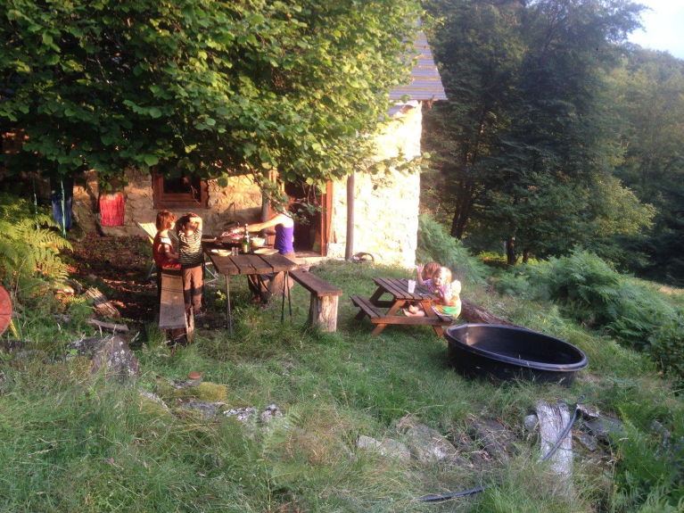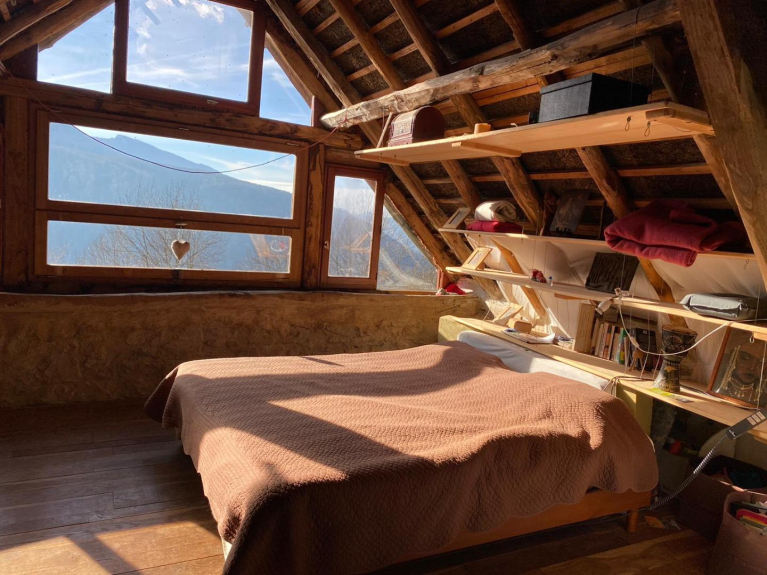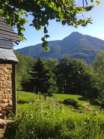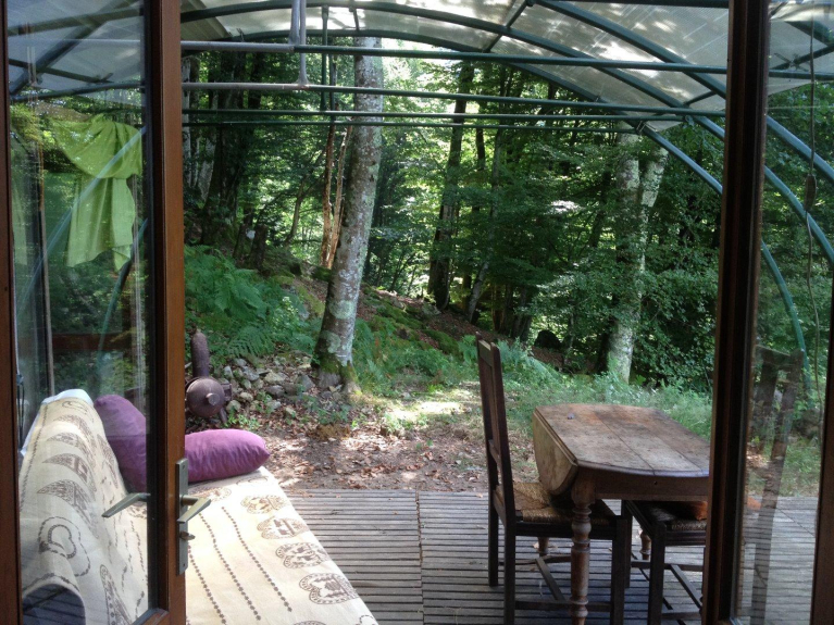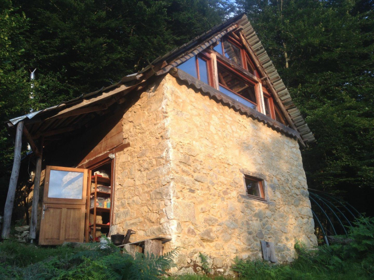 Un granero reconvertido en cabaña de trampero, en un claro aislado en el corazón del bosque, frente a las montañas, en el GR 78.