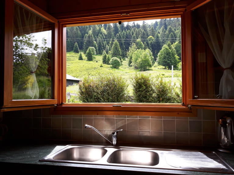 cafetera, tostadora, microondas, máquina de raclette... con vistas a la zona de juegos y a los prados de montaña.