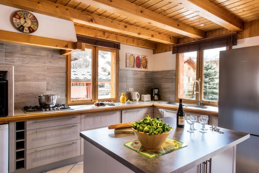 En la cocina abierta y bien equipada tendrá el placer de preparar deliciosas comidas que podrá compartir con sus amigos alrededor de la gran mesa o junto al fuego.
