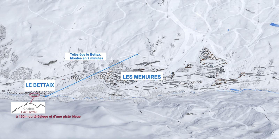 El telesilla desmontable situado a 250 m le lleva al corazón del dominio esquiable de Menuires -3 Valles (Val Thorens, Méribel, Courchevel, la Tania) en sólo 7 minutos.