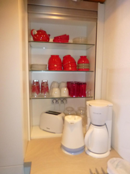 Una zona de cocina con una placa de inducción, una campana, un mini horno, un lavavajillas (dic. 2017), una vajilla de porcelana blanca, vasos de estilo montañés, numerosos armarios, una tostadora, una cafetera eléctrica con olla isotérmica, un hervidor eléctrico.