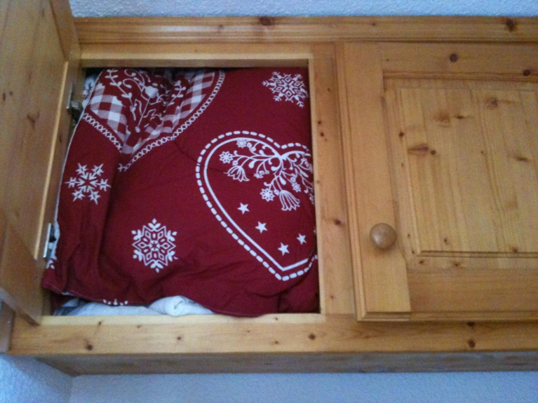 El piso tiene un dormitorio cerrado con una cama doble (140x190) y mucho espacio de almacenamiento.