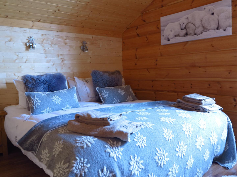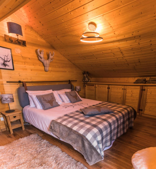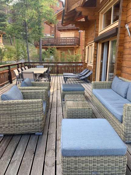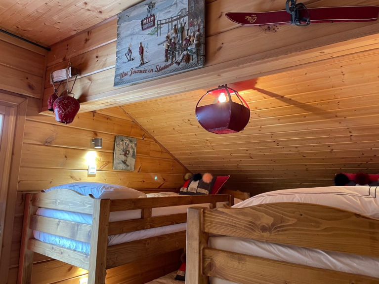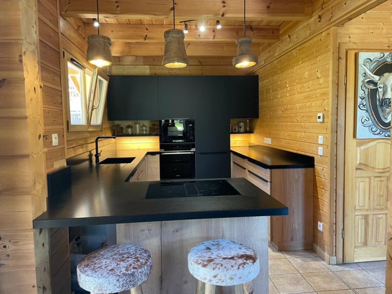 La planta baja se compone de un hall de entrada con una sala de esquí, la sala de estar y la cocina abierta con una superficie de 50 m2 que se abre a una terraza de 60 m2 le dará la bienvenida en su ambiente cocooning gracias a su estufa de leña, sus cómodos sofás y su TV incorporada. En la planta baja, una sauna y dos habitaciones dobles con TV, una con ducha privada y la segunda con bañera de hidromasaje. WC separado.