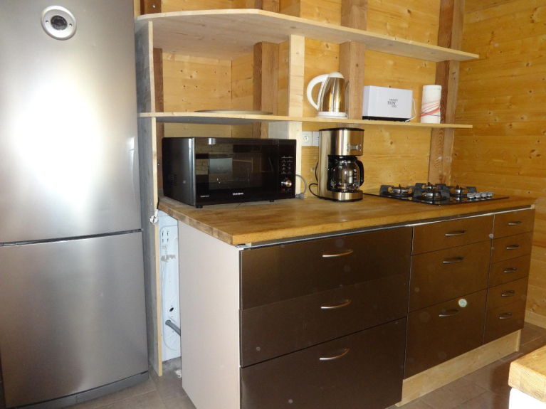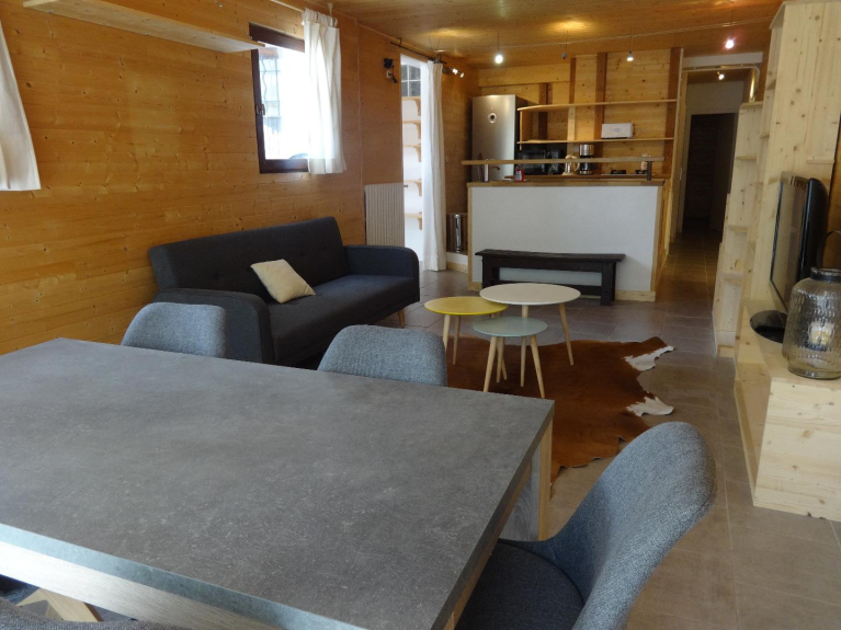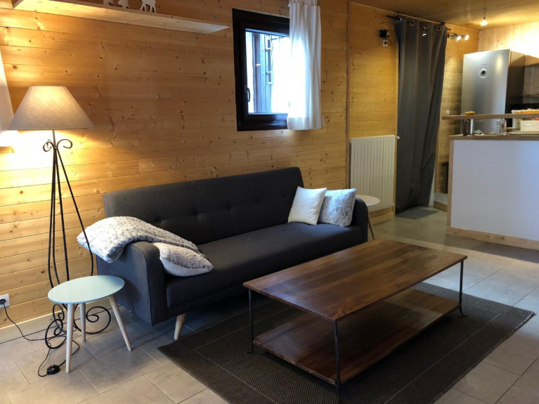 Se compone de un hall de entrada, una sala de estar con sofá, cocina totalmente equipada, 2 dormitorios, un cuarto de ducha, WC independiente.